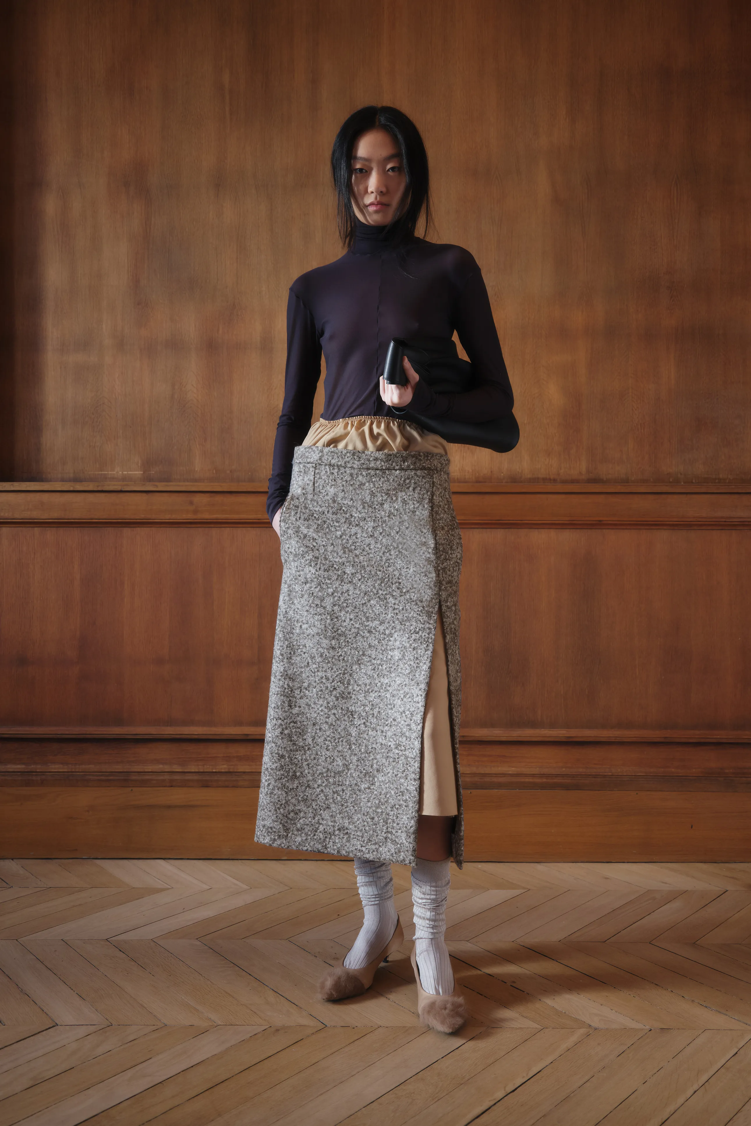 Je finis avec deux associations qui me ravissent mais demandent des pièces plus spécifiques : le jupon lingerie qui apparait sous une jupe structurée (Carven) et le grand pull d’homme sur une jupe brodée (Fendi), une idée qui marche avec toutes les pièces un peu sophistiquées et brillantes de son dressing.