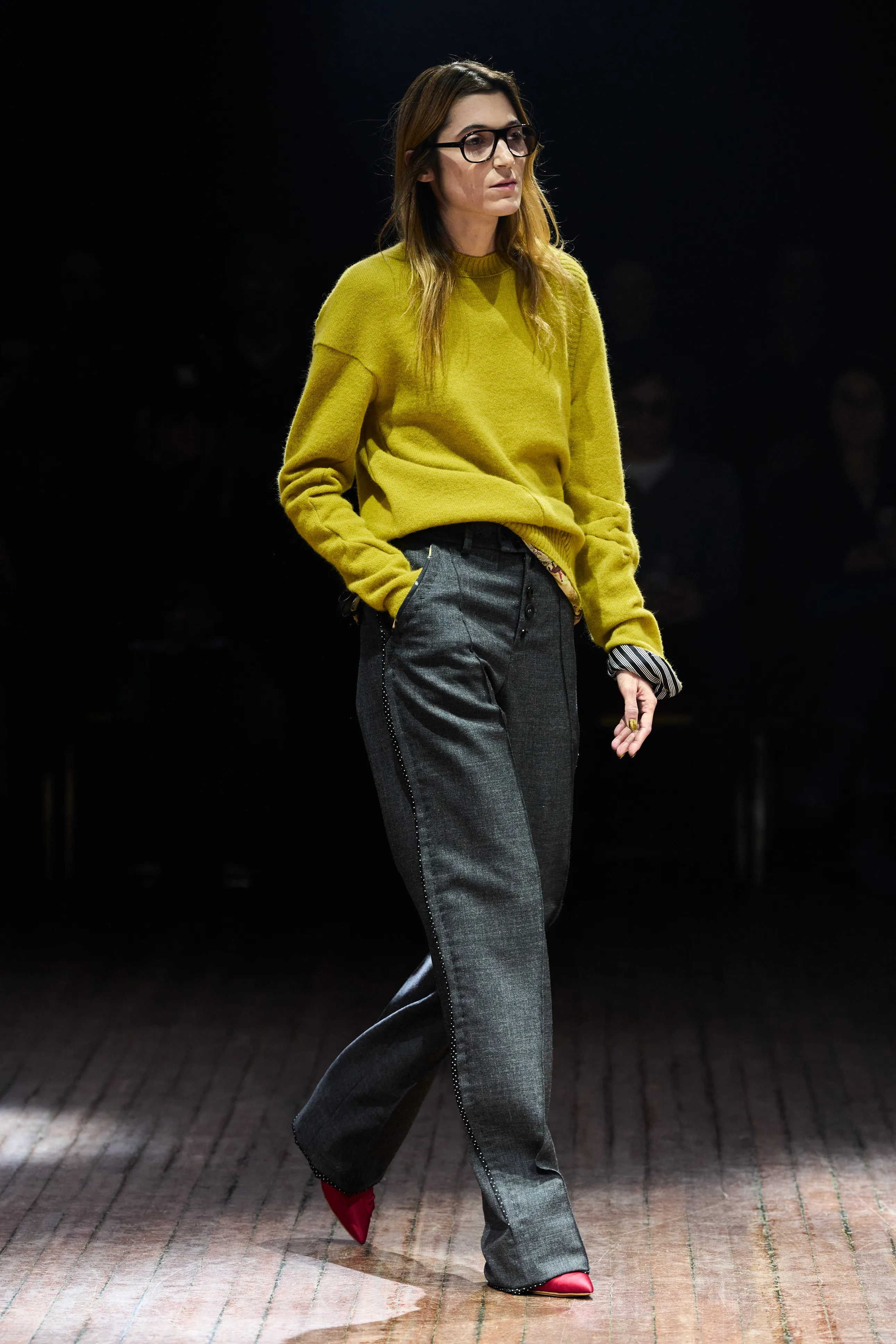Autre geste facile à reproduire et qui fait son effet : accumuler de gros bracelets dorés sur un pull, voire carrément sur un haut de jogging comme chez Miu Miu, le tout est qu’il y ait suffisamment de matière pour qu’elle soit coincée par les bracelets qui ainsi ne bougeront plus.