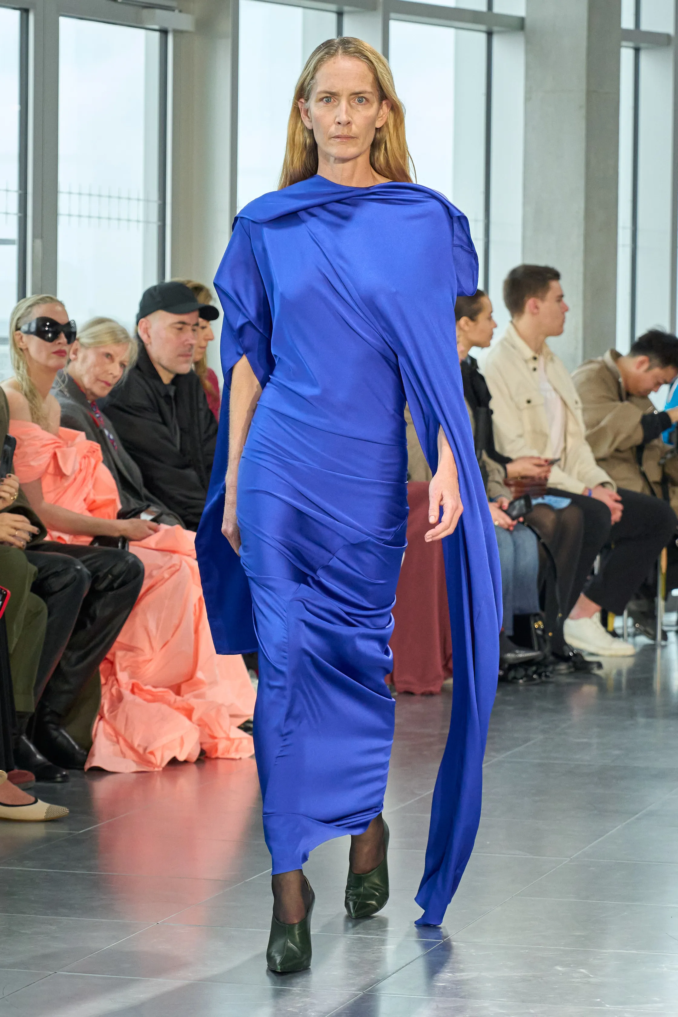 Cette saison, la taille est donc marquée et les hanches exagérées. Ottolinger va jusqu’à rendre visible des postiches asymétriques de hanche. Prenez une dernière inspiration et préparez-vous à rouler du bassin. Ou rouler des mécaniques, j’aurais pu écrire car ces silhouettes sablier évoque une fierté et puissance ostentatoire. Marine Serre dit de la mode qu’elle n’est que question d’archétypes et s’empare de celui-ci pour lui insuffler son esprit rebelle. Il n’y a donc jamais de réel retour en arrière, tout est question d’intention et de stylisme. La queen Vivienne Westwood nous l’avait déjà démontré en détournant le faux-cul victorien en icône punk et couture.